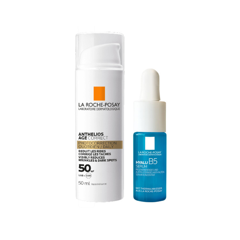 La Roche-Posay Anthelios Age Correct FPS50 Oferta Hyalu B5 Sérum é um pack composto por 2 cuidados de rosto: La Roche-Posay Anthelios Age Correct FPS50 (50ml) e La Roche-Posay Hyalu B5 Sérum (10ml). La Roche-Posay Anthelios Age Correct FPS50 é um cuidado diário com proteção solar elevada, com ação anti-envelhecimento que previne e corrige os sinais de envelhecimento em 4 semanas. Amplo Espectro de Proteção e ativos corretivos dermatológicos, com Ácido Hialurónico, Niacinamida e PHE-Resorcinol. Creme ultraleve com 24h de hidratação. Acabamento não-oleoso e aveludado na pele. Hipoalergénico. Não comedogénico. La Roche-Posay Hyalu B5 Sérum é um cuidado reparador que reduz significativamente as rugas, indicado para pele sensível, mesmo após procedimentos superficiais. Repara a barreira da pele. A fórmula contém Vitamina B5, melhora o processo de reparação da pele;  Madecassoside, ajuda na renovação da pele; Ácido Hialurónico, reduz as rugas, recheia a pele e aumenta o volume e a elasticidade da pele. Textura suave, fresca e fluida para confortar a sua pele.