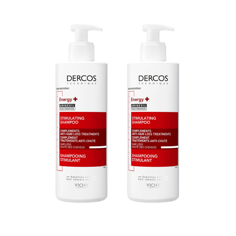 Dercos Energy+ Champô Estimulante Duo Preço Especial é um pack composto por duas embalagens de 400ml. Dercos Energy+ Champô Estimulante é um cuidado estimulante para todo o tipo de cabelos. A fórmula apresenta uma textura branca perolada e é enriquecida com Aminexil para ajudar a combater a queda de cabelo; e Niacinamida um ativo dermatológico apaziguante. A fibra é reforçada e o couro cabeludo mais saudável e desintoxicado em profundidade desde a raiz. Como aplicar: aplicar sobre o couro cabeludo e cabelo húmido. Massajar suavemente durante um minuto para ativar a microcirculação e, de seguida, enxaguar.