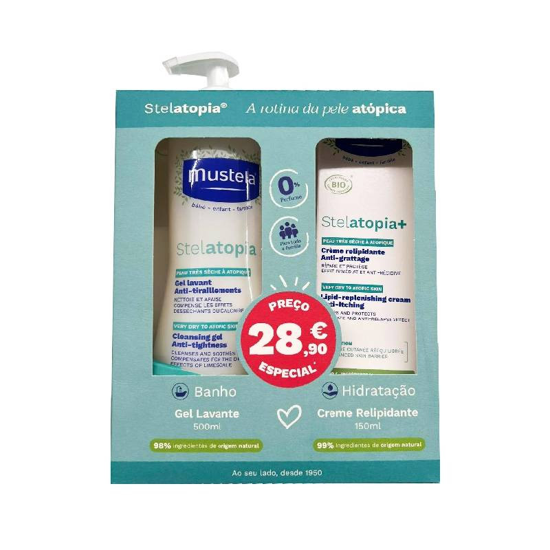 Mustela Stelatopia Gel Lavante + Creme Relipidante é um pack promocional composto por 2 cuidados: Mustela Stelatopia Gel Lavante (500ml) e Mustela Stelatopia+ Creme Relipidante (150ml).