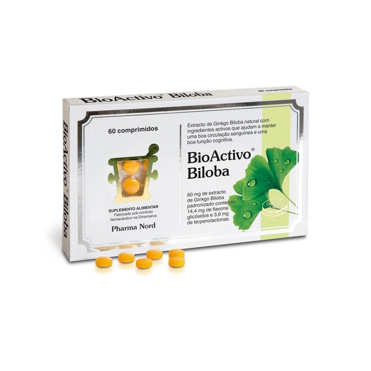 BioActivo Biloba ajuda a manter uma boa função cognitiva e uma boa circulação sanguínea. Contém 60 mg de extracto de Ginkgo Biloba padronizado, ou seja, cada comprimido contém 14,4 mg de flavono-glicosídeos e 3,6 mg de terpeno-lactonas. O elevado conteúdo de extracto de gikngo biloba (PN246 com 24% flavono-glicosídeos e 6% terpeno-lactonas) por comprimido torna possível atingir o efeito desejado em aproximadamente 4 semanas.