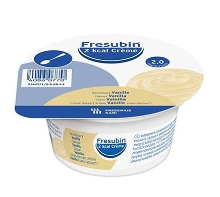 Fresubin 2kcal Creme alimentar é um suplemento hipercalórico (2,0 kcal/g) e hiperproteico (rico em proteínas) sob a forma de pudim. Contém elevado teor em proteínas: 12,5 g por embalagem e elevado teor de energia: 250 kcal por embalagem. Está indicado para satisfazer as necessidades nutricionais de indivíduos com ou em risco de malnutrição associada à doença em particular, indivíduos com necessidades energéticas e proteicas aumentadas, com restrição de fluidos e/ou disfagia (dificuldade em engolir). Apresenta uma consistência cremosa e espessada para comer à colher. Possui baixo teor em lactose. Isento de fibra e glúten.