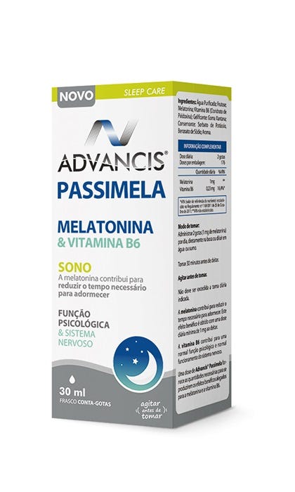 Suplemento alimentar com Melatonina e Vitamina B6, que contribui para reduzir o tempo necessário para adormecer.