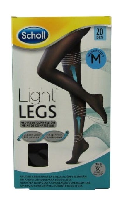 Scholl Light Legs collants de compressão 20DEN apresenta um fio elástico confortável que aplica pressão em pontos específicos. São respiráveis e com um design que os tornam resistentes à formação de malhas. Permitem até 50 lavagens sem perder a forma e a compressão. Compressão: 20 den (10 mmHg nos tornozelos, 5 mmHg nos gémeos e 3,5 mmHg nas coxas).