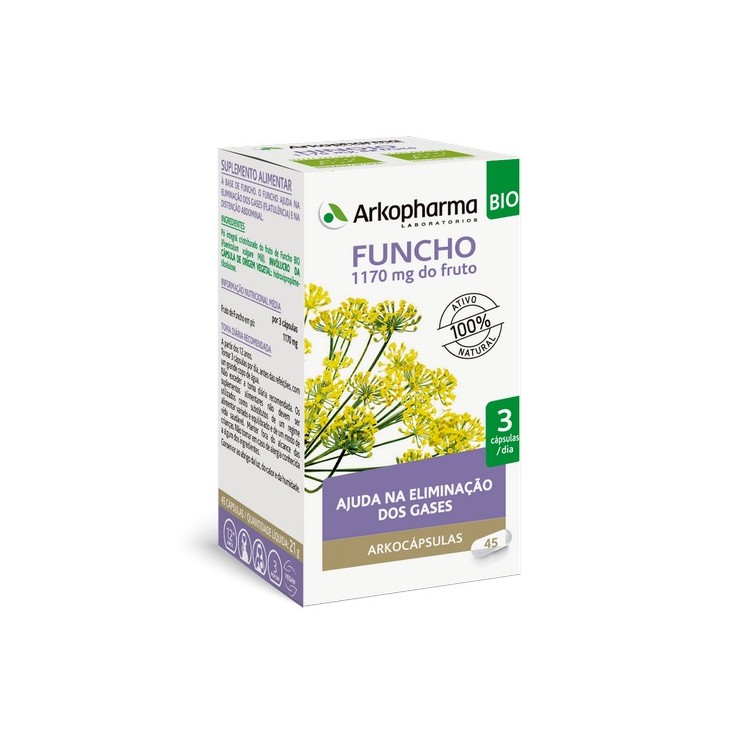ARKOCÁPSULAS Funcho é um suplemento alimentar à base de Funcho. O Funcho ajuda na eliminação dos gases (flatulência) e na distensão abdominal.