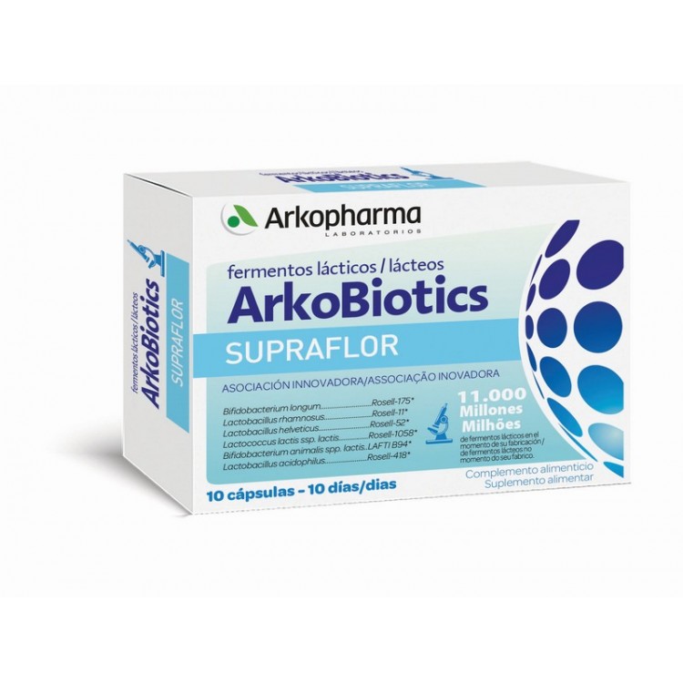 ARKOBIOTICS Supraflor é um suplemento alimentar com uma associação inovadora de 6 estirpes fermentos lácteos. Estirpes caracterizadas e documentadas por laaboratório especializado na área. Supraflor cápsulas tem 11.000 milhões de fermentos lácteos no momento do seu fabrico.