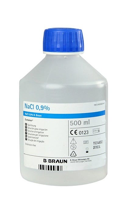 Soro fisiológico estéril para irrigação em embalagem com rosca ecotainer.