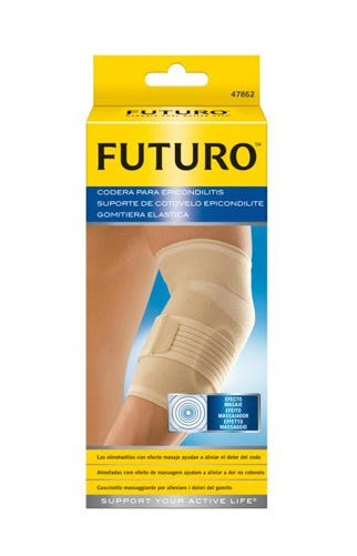 Futuro Suporte Cotovelo c/ Almofada p/ Epicondilite proporciona calor relaxante e compressão. O formato em manga fina acompanha a forma natural do braço e fica discreto sob a roupa. Feito de tecido com compressão de dupla elasticidade, suave e permeável ao ar, para um ajuste e conforto ideais. Fácil de colocar e retirar. Pode ser utilizado no cotovelo esquerdo e direito.