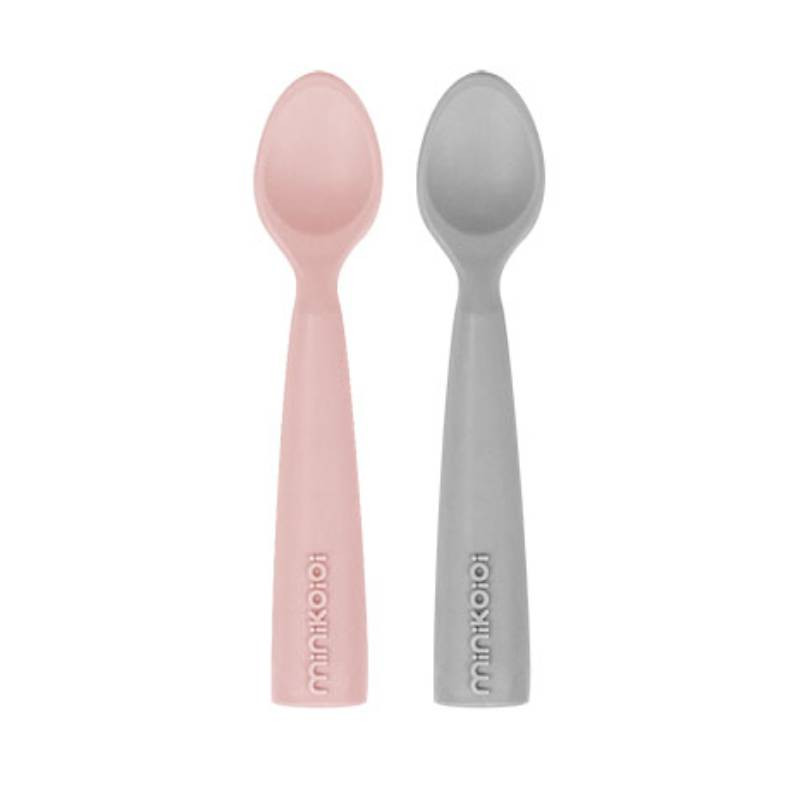 Minikoioi Colheres Silicone Rosa e Cinza +6M é um pack composto por 2 colheres macias e suaves, indicadas para as gengivas do bebé a partir dos 6 meses.